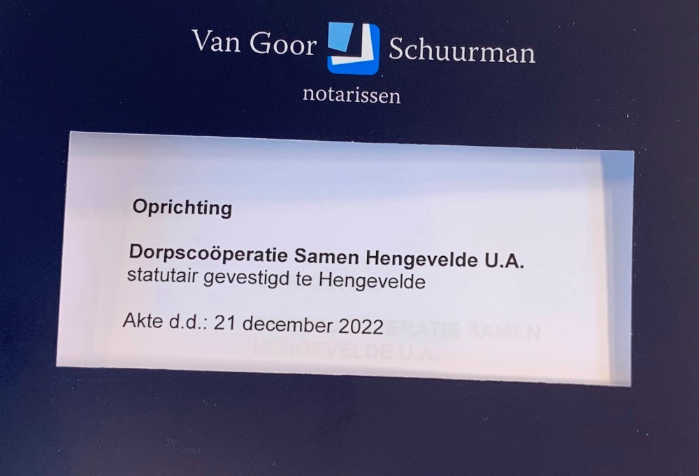 Vlak voor Kerst, op 21 december 2022, werden de handtekeningen gezet op de notariële akte. Daarmee staat Dorpscoöperatie Samen Hengevelde officieel op de kaart. Tim Jongman, één van de initiators en lid van het oprichtingsbestuur lacht tevreden. “Het heeft heel wat uitzoekwerk en overleguurtjes gekost van ons samen, maar het is de moeite waard. Deze vorm van samenwerking en belangenbehartiging past volledig bij de wens die al langere tijd leefde in ons dorp.” Vorig jaar, op 1 oktober, tijdens de bijeenkomst waarvoor alle inwoners van Hengevelde uitgenodigd waren, werd die behoefte nog weer eens bevestigd.